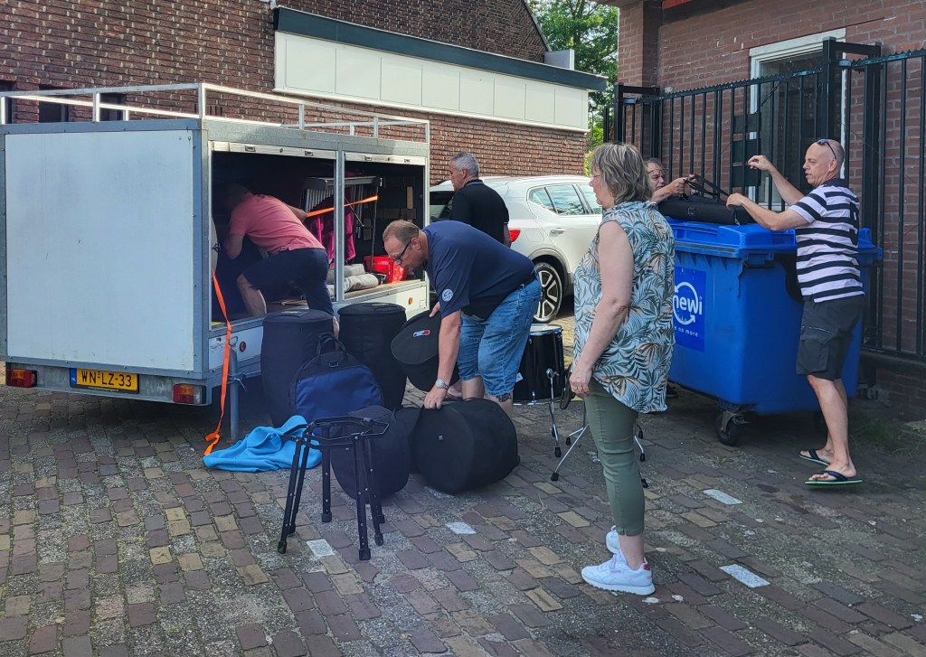 Er werd al vroeg verzameld bij het clubgebouw om de instrumenten in te laden. Binnen een half uur stond alles in de aanhanger en konden we vertrekken.