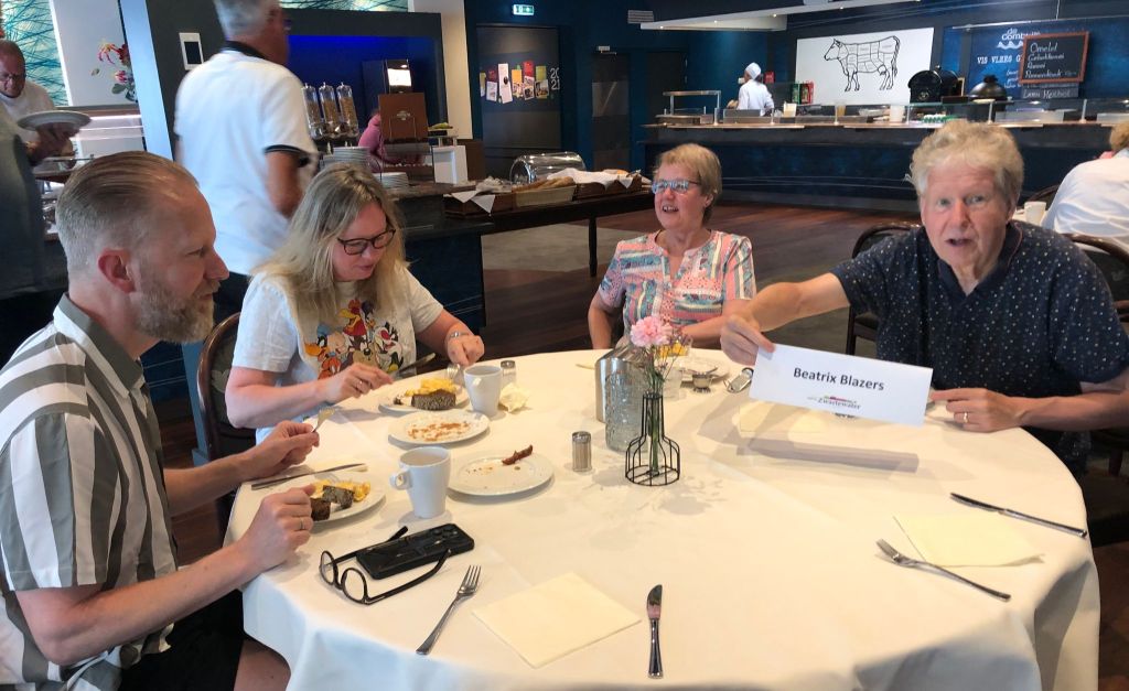 Na een uitermate zwoele nacht was het om 8.00 uur alweer tijd voor het ontbijt. De meesten stonden al meteen weer voluit aan, en er werd smakelijk gelachen om de avond ervoor. Op de tafel stonden bordjes met “Beatrix Blazers”, dit viel bij de dirigent en het slagwerk niet geheel in goede aarde. Uiteindelijk hebben zij gelukkig ook mogen eten. 😉