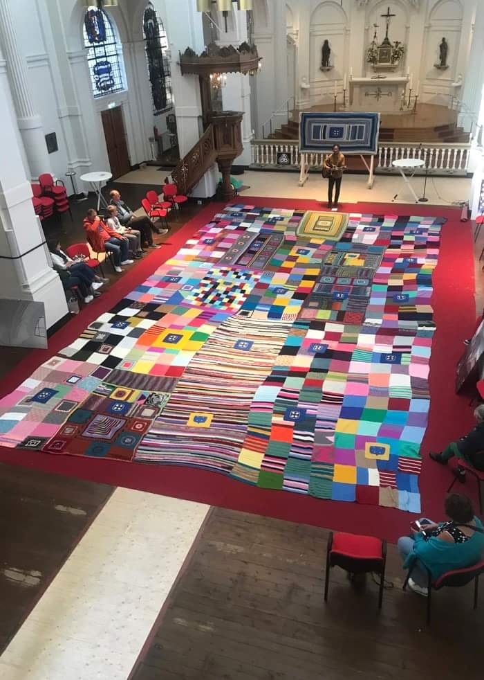 Op zaterdag 28 september mochten we de onthulling van de grootste deken van Hilversum muzikaal opluisteren. Deze deken is gemaakt door zo´n 50 handwerksters uit de gemeente Hilversum. Er is gehaakt en gebreid de afgelopen maanden, wat resulteerde in een deken van bijna 700 lapjes. Daarmee was de target ruim behaald, het hadden er ter ere van het 600 jarig bestaan van Hilversum in ieder geval 600 moeten zijn.