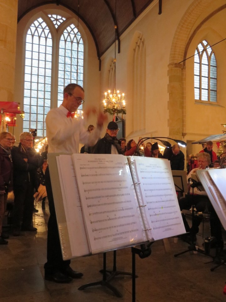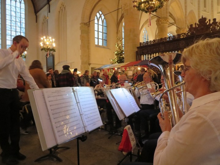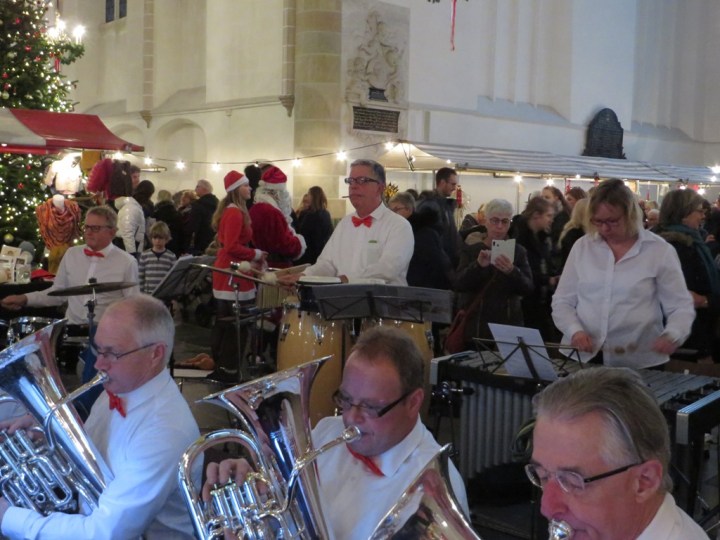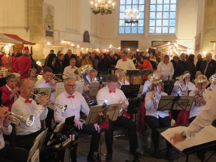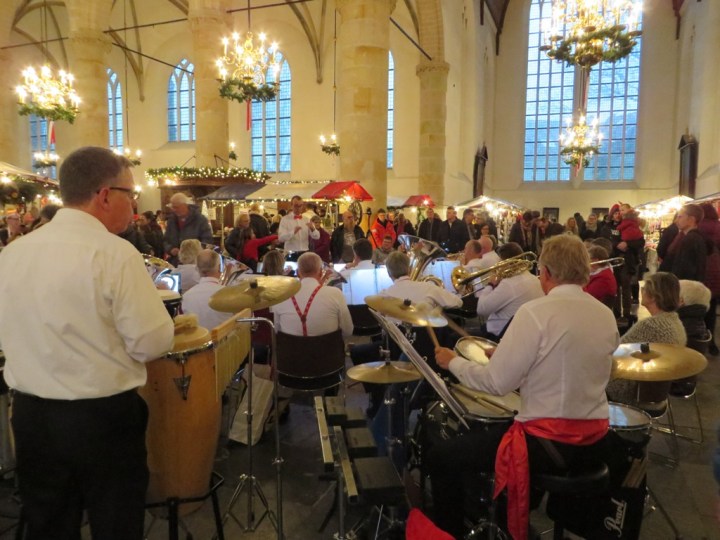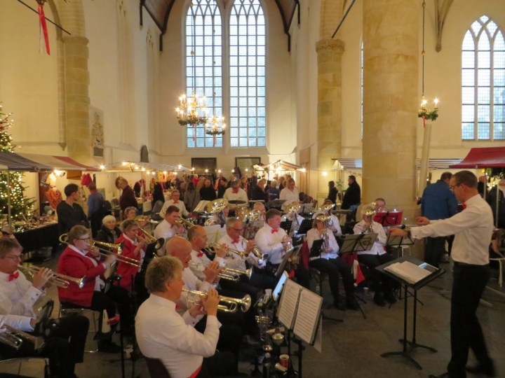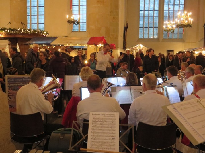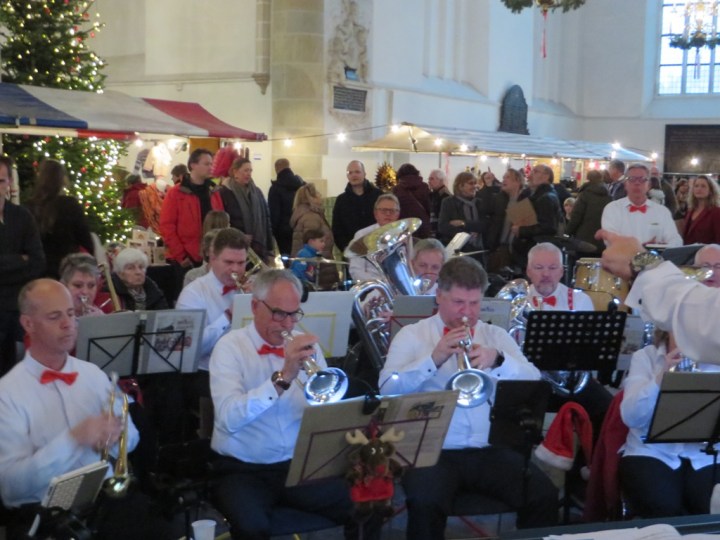De kop is er af. Vanmiddag hebben we de eerste van 7 kerstoptredens gedaan in de grote kerk van Naarden vesting. Tijdens de jaarlijkse kerstmarkt die dit keer in de kerk werd gehouden was de sfeer erg gezellig. Naast de vele kraampjes was het ook afgeladen met mensen. Prominent en midden in het kruis was plaats gereserveerd voor ons, zodat we van alle kanten waren te bewonderen. Menig maal zaten we dan ook in een kring van mensen te spelen. Ondanks de drukte bleef de akoestiek prima en hebben we een vol uur achter elkaar zitten spelen. Een prima start dus voor de komende 2 weken tot aan de kerst.