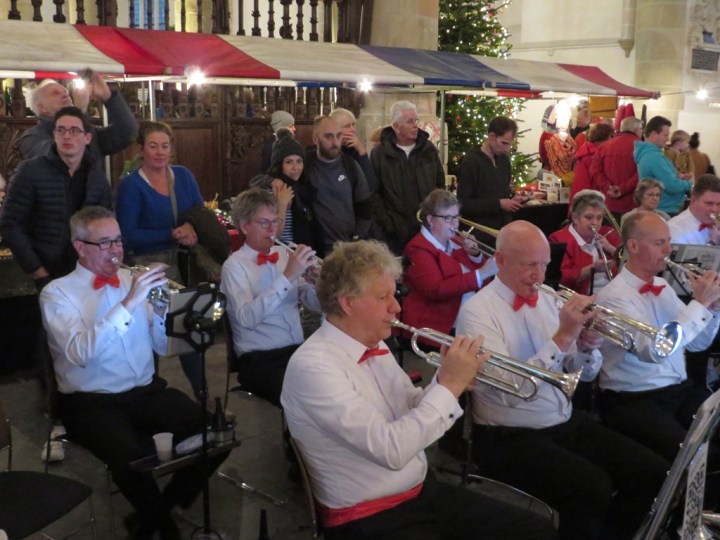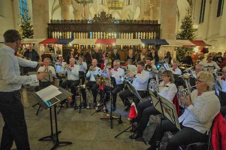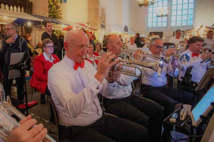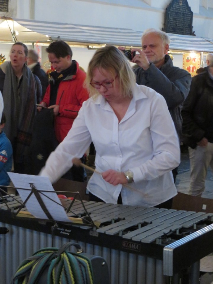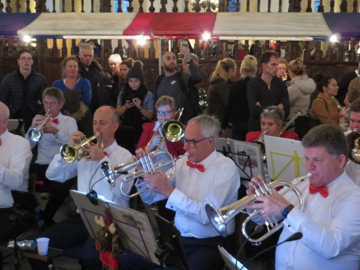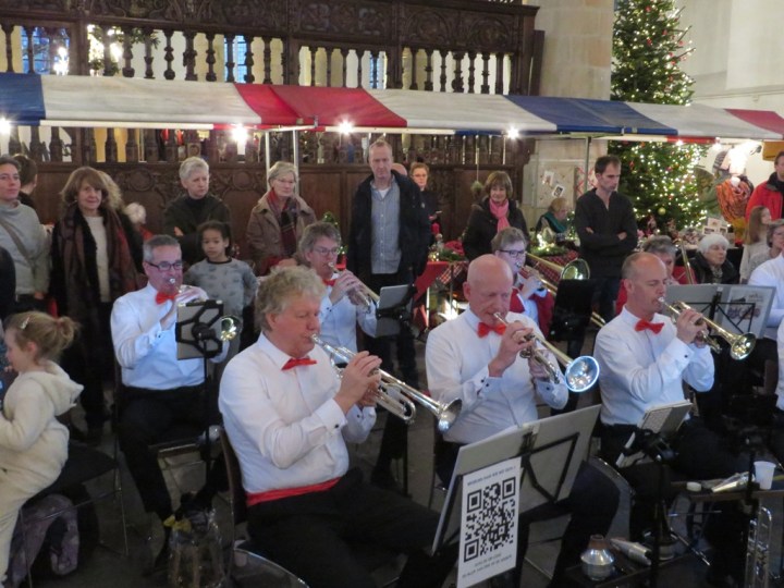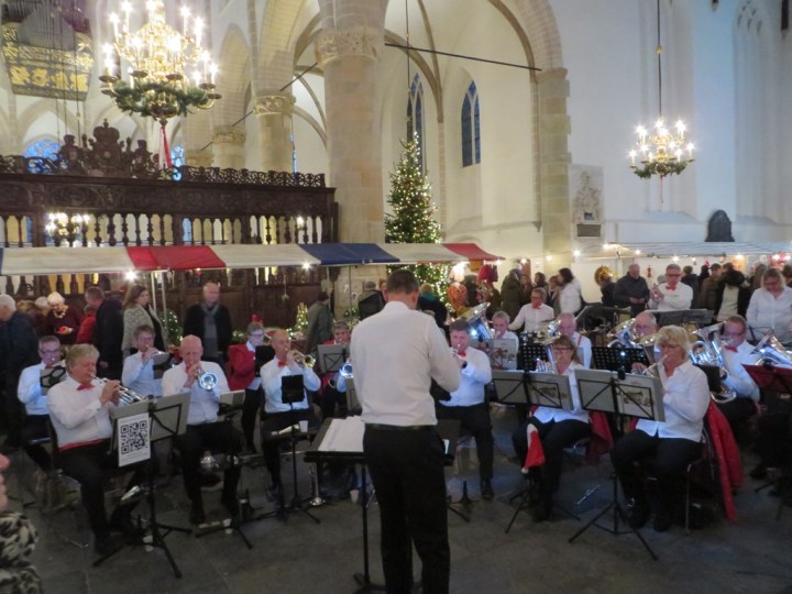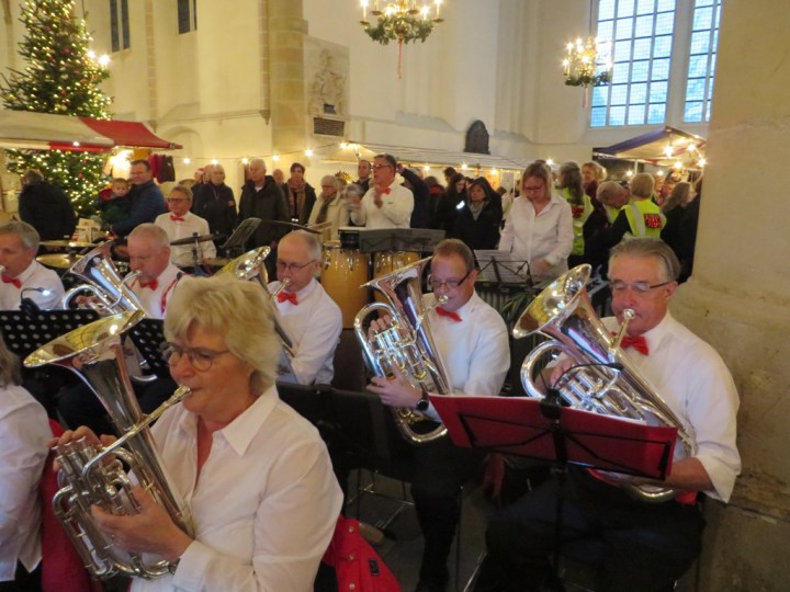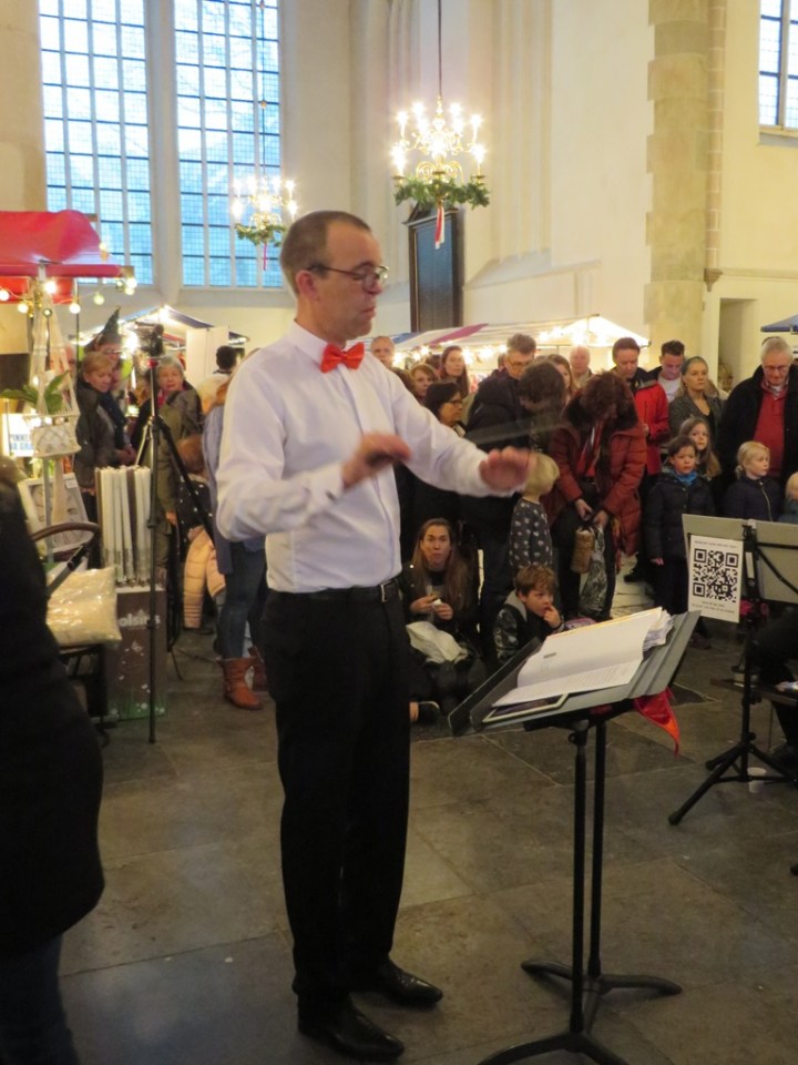 De kop is er af. Vanmiddag hebben we de eerste van 7 kerstoptredens gedaan in de grote kerk van Naarden vesting. Tijdens de jaarlijkse kerstmarkt die dit keer in de kerk werd gehouden was de sfeer erg gezellig. Naast de vele kraampjes was het ook afgeladen met mensen. Prominent en midden in het kruis was plaats gereserveerd voor ons, zodat we van alle kanten waren te bewonderen. Menig maal zaten we dan ook in een kring van mensen te spelen. Ondanks de drukte bleef de akoestiek prima en hebben we een vol uur achter elkaar zitten spelen. Een prima start dus voor de komende 2 weken tot aan de kerst.