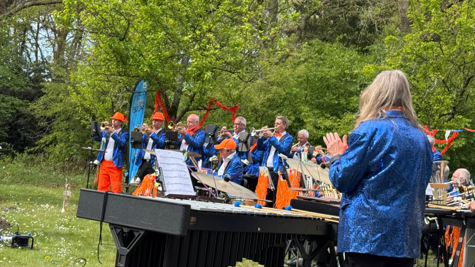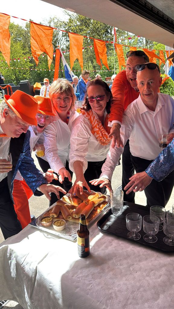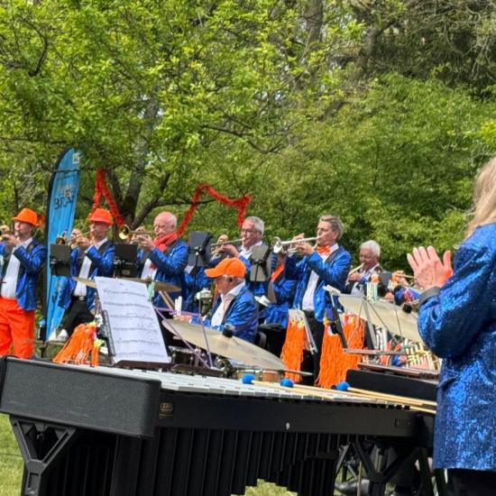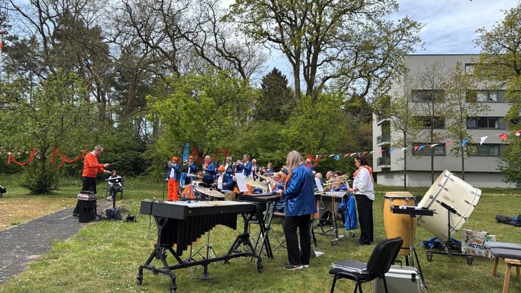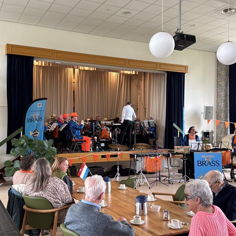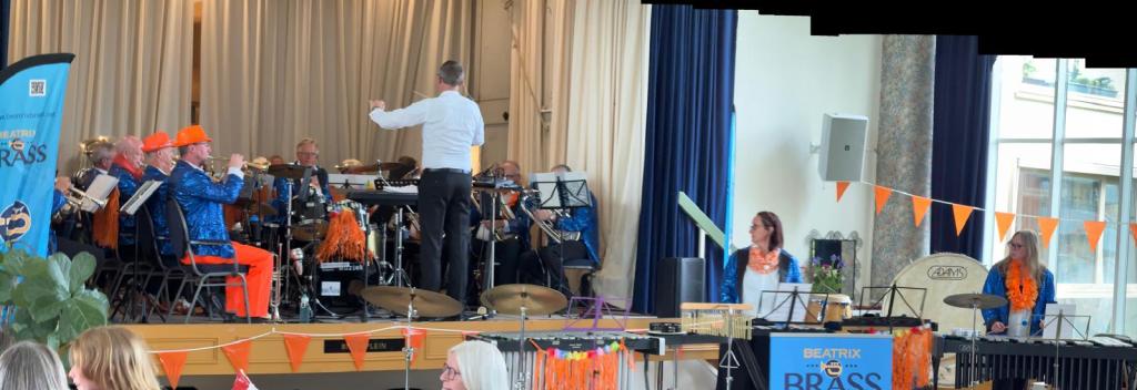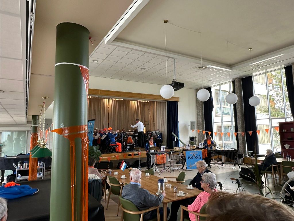 Daarna als de wiedeweerga weer inladen en op naar Care Residence op Zonnestraal. Hier komen we al jaren! Bekende gezichten, uitstekende catering, en het weer werkte dit jaar fantastisch mee. Het was zelfs warm in het zonnetje, dus we konden in onze glitterjassen spelen in plaats van de clubjassen. De bewoners genoten volop en na afloop bleef het nog een tijdje gezellig, met overheerlijke worstenbroodjes. Daarna was iedereen vrij om de rest van Koningsdag op zijn eigen manier te vieren.