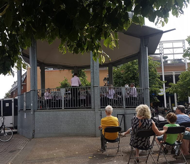 Wat zat het weer lekker mee zaterdag. Prima temperatuur, geen brandende zon maar wel genoeg om een drankje op het terras te pakken. En dat deden velen. Naast veel van de vaste suporters zijn ook veel mensen even op de stoelen voor de muziektent gaan zitten om te luisteren naar ons laatste concert van dit seizoen.